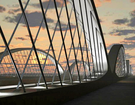TxDot engineers came up with the idea of marrying two types of bridge construction to meet Fort Worth's requirements: a network-arch bridge and a precast-concrete bridge. A network-arch bridge is architecturally interesting but typically made of more costly steel and because it is built in place, it causes more disruption of traffic; a precast-concrete bridge, although not as aesthetically pleasing, is more economical, quicker to build, and requires much less lane closure time because the major components are built off-site.